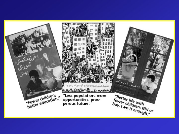 2006 "It is said that two children is enough. I oppose this, " President Mahmoud Ahmadinejad told legislators. "Our country has a lot of capacities. It even has the capacity for 120 million people. “ reduction in working hours for women to allow for more child bearing & rearing