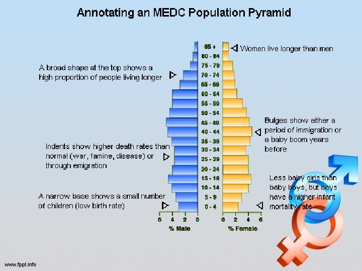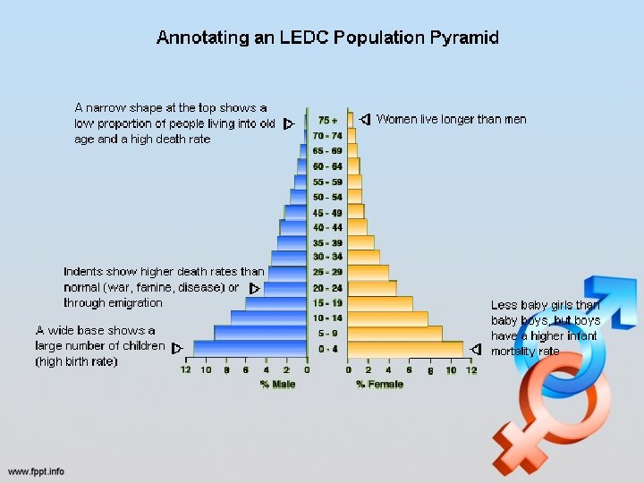 Change over time • Over time, as a country develops, the shape changes from young to intermediate to old • If a country has a lot of young people it will become larger more quickly • Improvements in health will straighten the sides and add height • Conflict will cause an imbalanced pyramid with more women than men • Baby Booms will cause a sudden increase in birth rates • Disease can cause a sudden drop in different age groups • Migration will cause a bulge from 20 s to 40 s