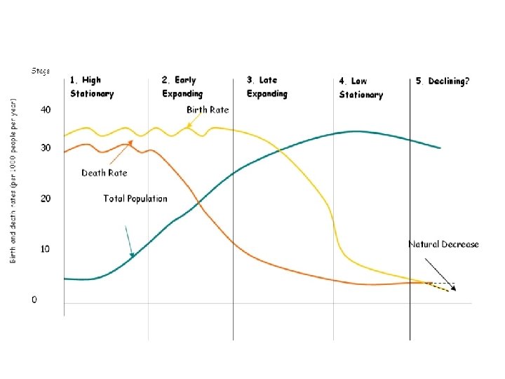 Stage 5 - Declining n Birth Rate: Slight fall n Death Rate: Stable n Natural Increase: Gentle decrease n Example: Germany (in the future)