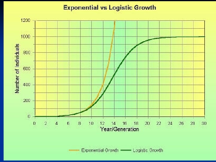 Logistic Growth n Obviously exponential growth can not continue for very long. n As resources become less available, the growth of a population slows or stops. n Logistic growth occurs when a population’s growth slows or stops following a period of exponential growth