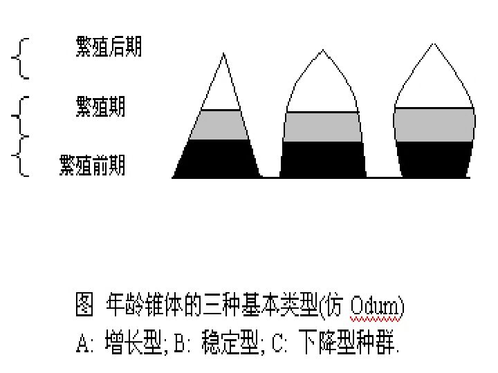 The age structure of a population is the number of Age and stage structure individuals in each age class expressed as a ratio, and is usually displayed as an age pyramid diagram. A population which is neither expanding nor contracting will have a stationary age distribution. A growing population will have more young. While a declining population will be dominated by older age classes. 种群的年龄结构是每一年龄阶段个体数目的比率, 年龄和时期 结构 通常以年龄金字塔图来表示。既不增长也不下降的 种群有稳定的年龄分布。增长型的种群有更多的年 轻个体,而在下降型种群中年老的个体占优势。