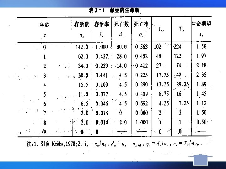 Life tables show the number of individuals present at different life stages or ages together with age-specific survival rates and age-specific mortality rates calculated for each stage. Mortality at each stage is expressed by k-values which are derived from logarithms and can be summed to give total mortality 生命表表示存在于不同生命阶段或年龄个体的数量,以及每 一阶段的年龄特定存活率和年龄特定死亡率。每一阶段的死 亡率用k值表示,k是通过对数函推导出来的,并且可以相加 得出总死亡率。