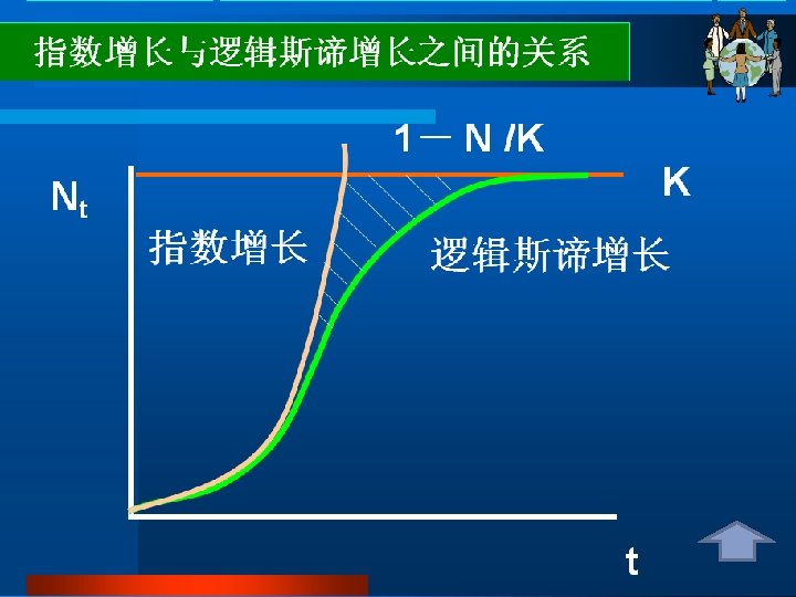 The changes in population size over time can be calculated by adding birth (B) and the number of population immigrants (I)to the original population at time t, (Nt ), growth and subtracting the number of deaths (D) and emigrants (E) to give a new population size an the time t+1(Nt+1). This is represented by the equation; N t+1 = N t +B + I – D – E 种群增长 种群大小随时间的变化可以按如下方法计算:t时间种 群原来数量(Nt),加上新出生的个体数(B)和迁入 个体数(I),减去死亡个体数(D)和迁出的个体数 (E),就可得到t+1时间种群的数量(N t+1),这可 用以下方程表示。 N t+1= Nt +B + I – D – E