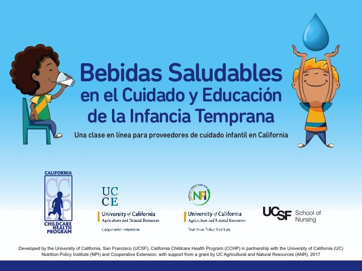 Reconocimientos Las siguientes personas contribuyeron al desarrollo, revisión y redacción de esta clase en línea: Abbey Alkon, Bobbie Rose, Kim Hazard: Escuela de Enfermería de la Universidad de California en San Francisco (UCSF), Programa de Salud para el Cuidado Infantil de California (CCHP); Lorrene Ritchie, Christina Hecht, Kenneth Hecht, Gemma Di. Matteo: Instituto de Políticas de Nutrición (NPI), Division de Agricultura y Recursos Naturales de la Universidad de California (UC ANR); Anisha Patel: Departamento de Pediatría de la UCSF; Marisa Neelon: Extensión Cooperativa de la UC (UCCE), UC ANR, Condados de Contra Costa y Alameda; Katherine Soule: UCCE, ANR, Condados de San Luis Obispo y Santa Barbara; Karina Diaz-Rios: UC ANR, Instituto de Investigación en Ciencias de la Salud en UC Merced; Genevieve Pyeatt: Child Development Inc. ; Paula James: Mesa redonda del Programa de Alimentación en Centros de Cuidado Infantil y la Junta de Cuidado Infantil de Contra Costa; Siobhan Tellez, Allison Beattie, Alison Borrman, Nicole Chamness: Escuela de Enfermería de la UCSF, estudiantes contribuidores; Laura Myers Design Sonia A. Guerra, Yania Rodriguez: Narración
