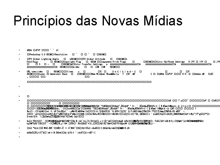 Princípios das Novas Mídias • “Conclusão filosófica” de Manovich: O computador modela seu mundo programável e representa dados de forma variável e não constante • “. . . tudo pode ser definido como variável, a fim de que o usuário possa modificar (o objeto) livremente. Queremos e necessitamos este tipo de liberdade? ” (p. 91)