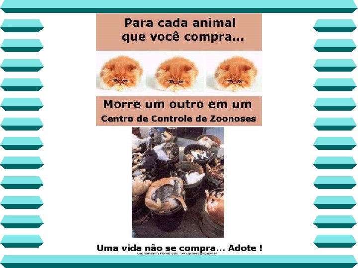 Quando quiser um animal de estimação, vá ao seu encontro nos abrigos protetores, onde muitos animais estão esperando por um amigo verdadeiro: VOCÊ! Ensine desde cedo, a compaixão a seus filhos, e que a beleza não está na aparência e nem no pedigree e sim, no interior e na bondade de cada um, sejam humanos ou não-humanos.