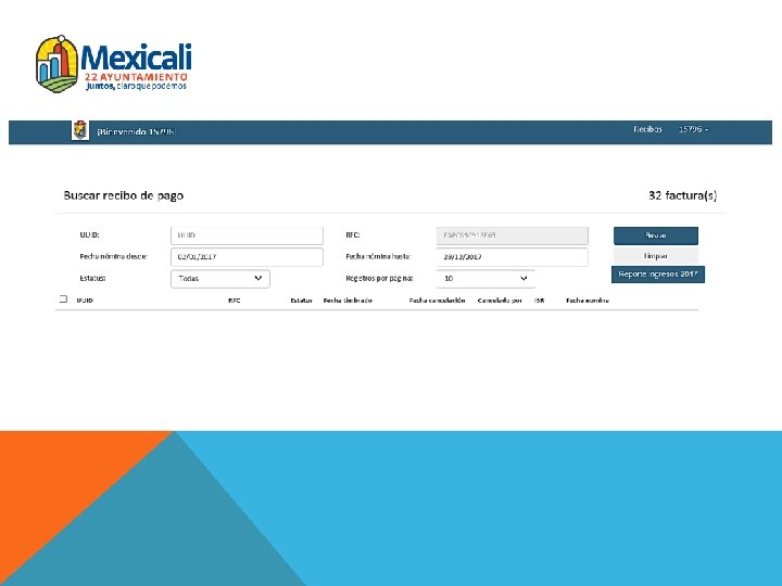 • EXPEDICIÓN DE CONSTANCIAS DE PERCEPCIONES Y RETENCIONES EJERCICIO 2017 Los contribuyentes que requieran acceder a los comprobantes fiscales timbrados por el Ayuntamiento de Mexicali, deberán seguir el siguiente procedimiento: 1. Ingresar a la liga: http: //www. mexicali. gob. mx/Consulta. Nomina 2. Entrar con los datos del interesado: Ø Usuario = Número de Empleado (con cinco dígitos ejemplo: 02467) Ø Contraseña = RFC del empleado (con trece caracteres alfanuméricos en mayúsculas, ejemplo: CAJS 810518 D 66) Ø En el menú principal puede seleccionar “Editar perfil” para cambio de contraseña.