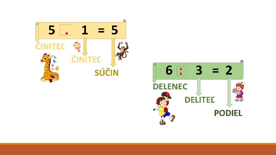 Násobenie a delenie Násobenie (súčin) a delenie (podiel) má prednosť pred sčítaním (súčtom) a odčítaním (rozdielom). Ak je v príklade len násobenie a delenie, počítame zľava doprava. 25 – 5. 3 + 14 – 18 : 3 + 2 = 25 – 15 + 14 – 6 + 2 = 20 96 : 6 – 90 : 6 = 16 – 15 = 1 12 – 3. 3 = 12 – 9 = 3 26 – 12 : 3 + 5 = 26 – 4 + 5 = 27 3. 5. 2 : 5. 4 : 8 = 15. 2 : 5. 4 : 8 = 30 : 5. 4 : 8 = 6. 4 : 8 = 24 : 8 = 3