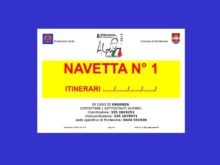 COMUNICAZIONI RADIO CANALE DIR 00…… Sede Pordenone 0434 551928 Cellulare 335 1079071 (Pordenone 2) Comunicare arrivo postazione e con radio solo comunicazioni «normali» eventuali problemi solo tramite telefono. Ogni postazione è identificata da una numerazione ATTENZIONE CI SENTONO TUTTI …. DIMOSTRIAMO LE NOSTRE CAPACITA’ E PROFESSIONALITA’…………SI COMUNICA SOLO QUANDO NECESSARIO Per le navette sabato 3 maggio ore 8, 30 prova percorsi e ricezione radio.