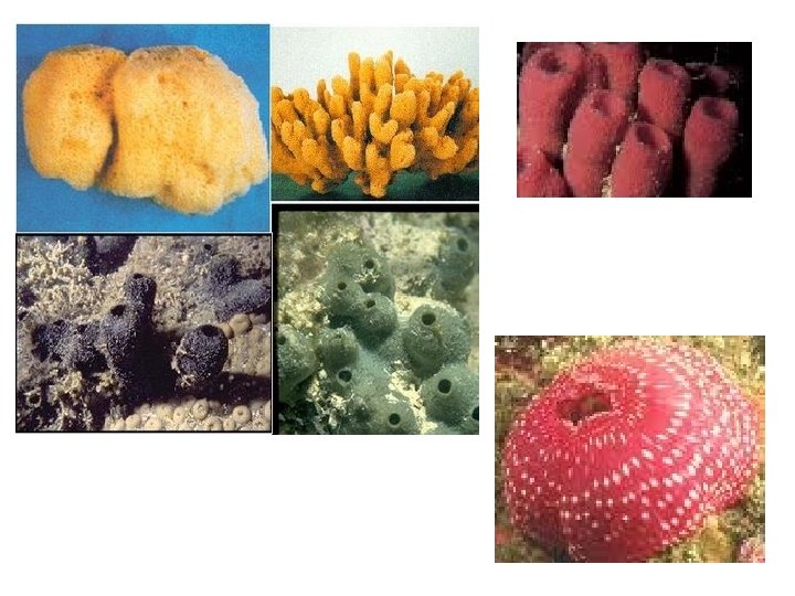 Características gerais • São animais portadores de poros; • São aquáticos, exclusivamente marinhos, existindo algumas espécies de água doce; • Habitam o fundo dos oceanos e mares ou águas costeiras; • Vivem fixados em recifes de corais ou outras superfícies duras; • Formados por células unidas, porém não formam tecidos verdadeiros e muito menos órgãos; • Cada tipo celular executa determinada função; • São animais filtradores; • São indicadores de poluição, pois são raros em águas poluídas. • São animais aneuromiários, ou seja, não apresentam sistema nervoso e muscular.