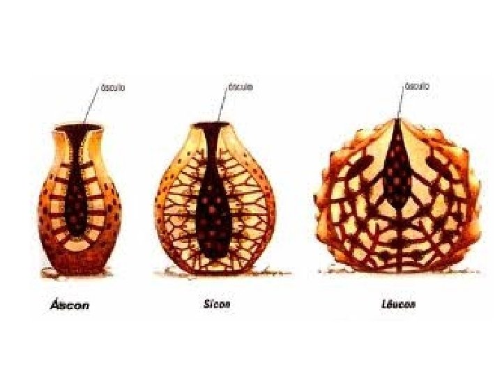 • Sícon: parede mais espessa e enrugada, formando canais abertos para fora e para dentro: os inalantes e os exalantes. Inalantes: ligam-se com o meio externo pelos poros. Exalantes: localiza-se os coanócitos, comunica-se com o átrio.