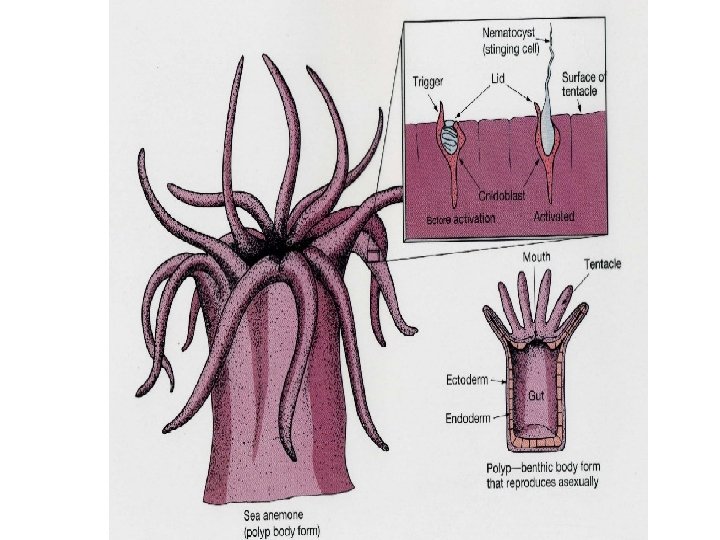 • COELENTERATA • Dari kata Coilos= berongga dan enteron = usus. • Jadi hewan ini mempunyai satu rongga di tengah 2 tubuhnya yang berfungsi seperti Usus pada hewan 2 tingkat tinggi. Rongga itu disebut rongga Gastrovaskuler. • Tubuhnya berbentuk Simetri Radial dan terdapat Tentakel disekitar mulutnya yang berfungsi untuk menangkap dan memasukkan makanan ke dalam tubuhnya. • Tentakel vang dilengkapi sel Knidoblas yang mengandung racun sengat disebut Nematokis (ciri khas dari hewan berongga).