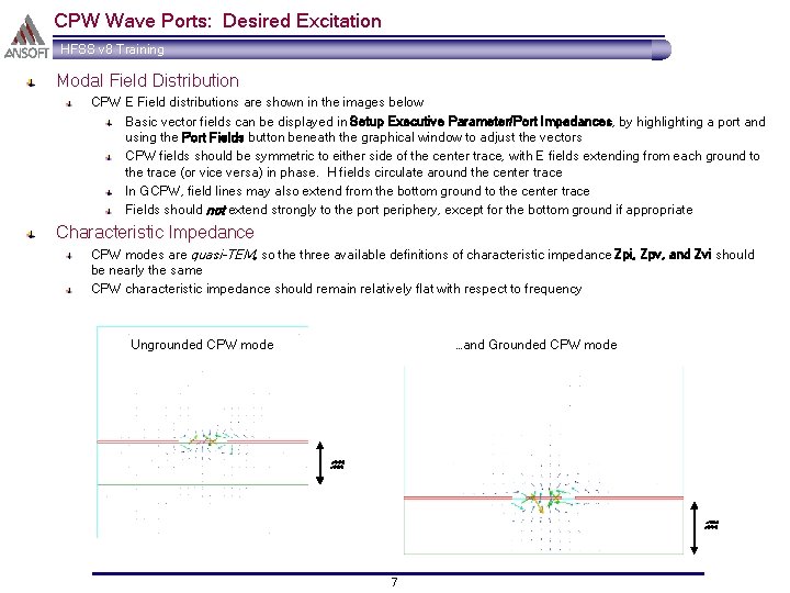 CPW Wave Ports: Impedance and Calibration HFSS v 8 Training Impedance Lines Optional for wave ports, but if Zpv and Zvi desired, should be drawn Extend from either side ground to proximal point on trace, colinear with top edge of substrate Port width should be no less than 3 x the overall CPW width, or 3 x (2 g + w) Port height should be no less than 4 x the dielectric height, or 4 h Calibration Lines Optional for wave ports, used only if phase referencing between multiple ports (for transmission phase parameters) are important The calibration line can be identical to the Impedance line. GCPW For grounded CPW, the Impedance and Calibration lines usually still extend from side ground to trace. However at the user’s discretion it may be desired to run the lines from the underlying ground to the trace instead. Usually this line orientation would only be desirable if the dielectric thickness is on the same order as the gap width of the CPW geometry. Use the port field distribution as an indication of which ground location is more important to your particular mode shape 6