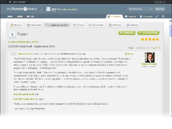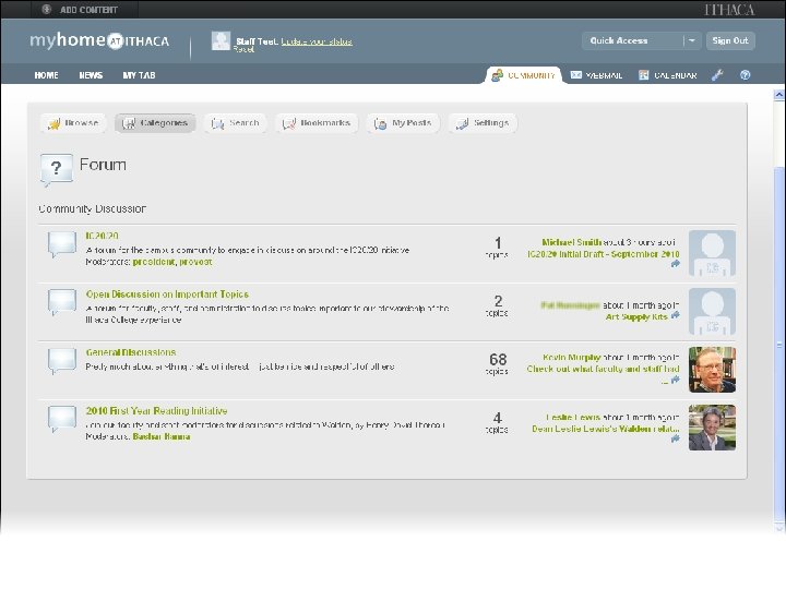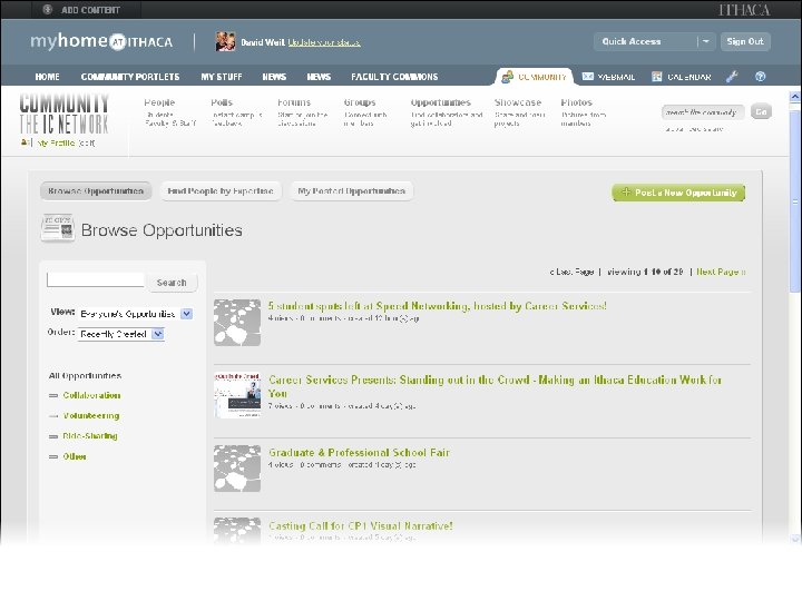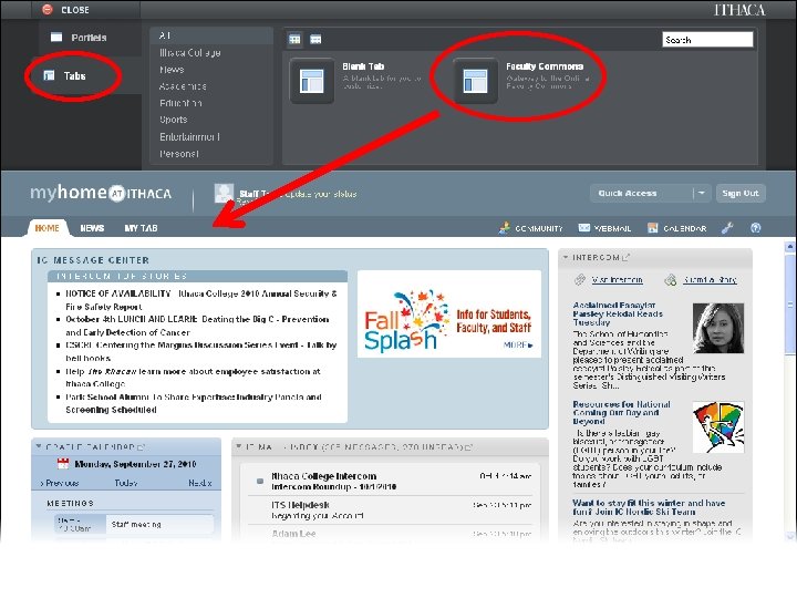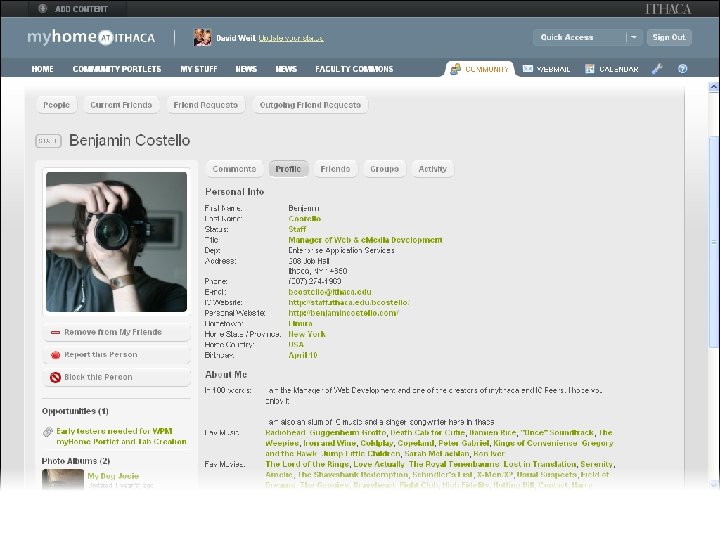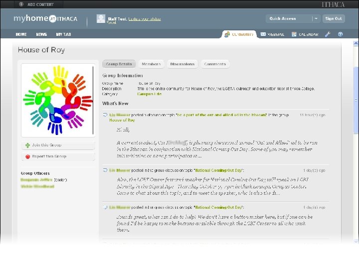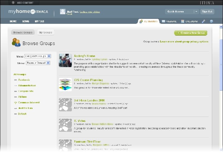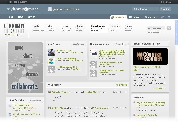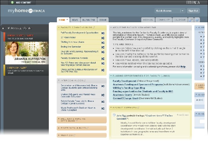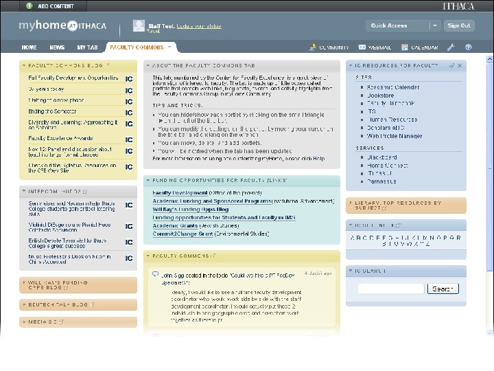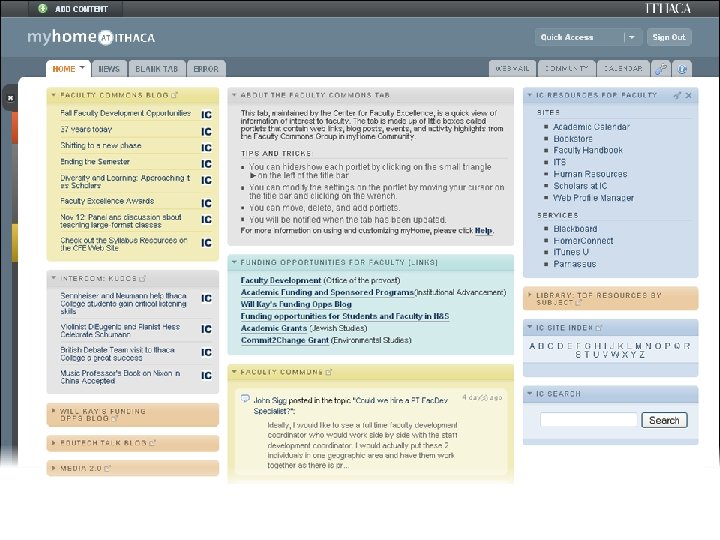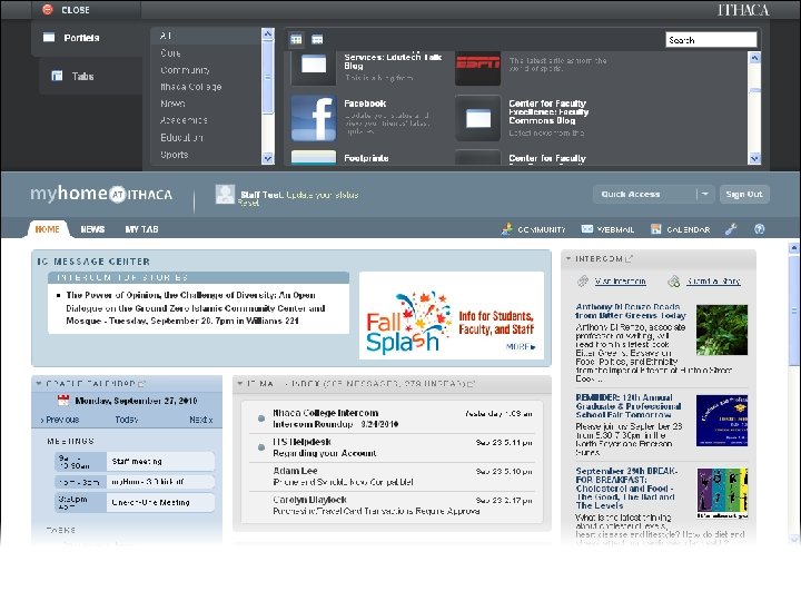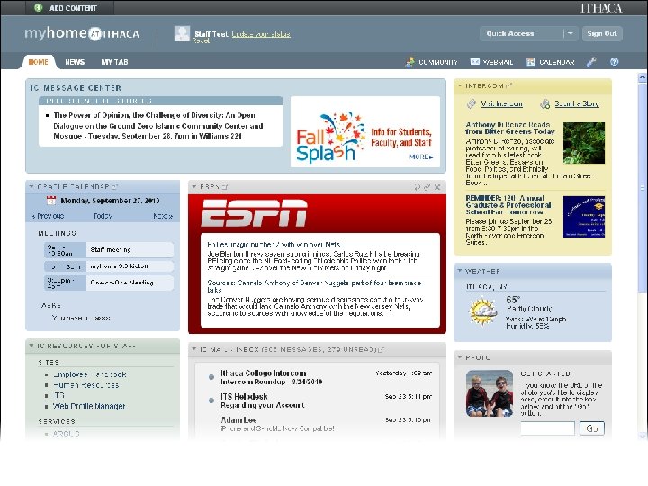 myhome@ithaca Web Portal • Deployed Fall 2008 • Major upgrade Spring 2010 • Developed in-house • Blends traditional portal w/social networking, other tools