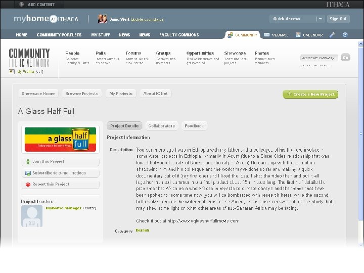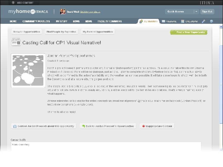 Build Community Increase Security Provide a Rich Web / Mobile Experience Blend Onand Off. Campus Worlds Thanks! • • Streamline Content Delivery Rethinking the Campus Portal Unify the Campus David Weil dweil@ithaca. edu or myhome@ithaca. edu Information site: www. ithaca. edu/myhome Presentation is on the EDUCAUSE Conference Site