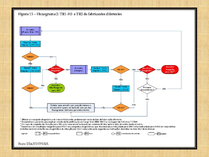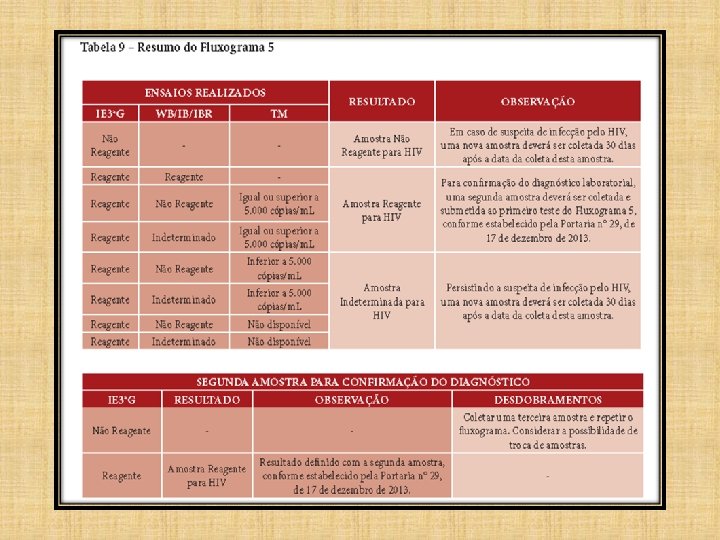 ALTERAÇÕES A SEREM INCORPORADAS NO LAUDO • Amostra com resultado reagente no TR 1 -FO deverá ser submetida ao TR 2. – A amostra com resultados reagentes no TR 1 -FO e no TR 2 : “Amostra Reagente para HIV”. – O laudo deverá incluir a seguinte ressalva: “Resultado definido com o Fluxograma 2, conforme estabelecido pela Portaria nº 29, de 17 de dezembro de 2013”. • Recomenda-se, ainda, que seja incluída no laudo: Sugere-se a realização imediata da carga viral (CV).