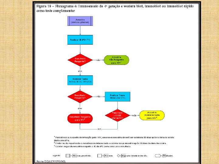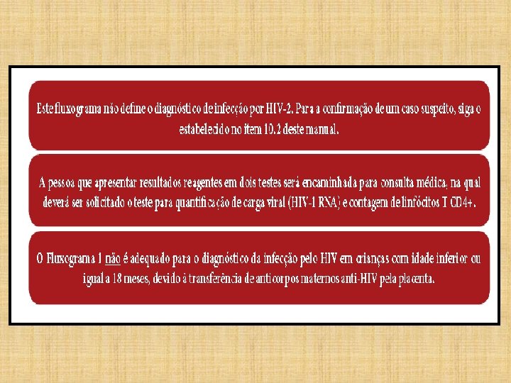 DIAGNOSTICO DO HIV EM CRIANÇAS COM IDADE INFERIOR A 18 MESES • A passagem transplacentária de anticorpos maternos do tipo Ig. G anti-HIV, principalmente no terceiro trimestre de gestação, interfere no diagnóstico sorológico da infecção vertical. • Os anticorpos maternos podem persistir até os 18 meses de idade. – Métodos que realizam a detecção de anticorpos não são recomendados para o diagnóstico em crianças menores de 18 meses de idade, sendo necessária a realização de testes moleculares (TM), como, por exemplo, a quantificação do RNA viral (carga viral - CV), disponibilizada pelo DDAHV do Ministério da Saúde.