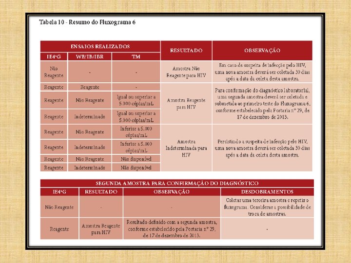 ALTERAÇÕES A SEREM INCORPORADAS NO LAUDO • Amostra com resultados reagentes no TR 1 e no TR 2: “Amostra Reagente para HIV”. • O laudo deverá incluir a seguinte ressalva: “Resultado definido com o Fluxograma 1, conforme estabelecido pela Portaria no 29, de 17 de dezembro de 2013”. • Recomenda-se, ainda, que seja incluída no laudo: Sugere-se a realização imediata da carga viral (CV).
