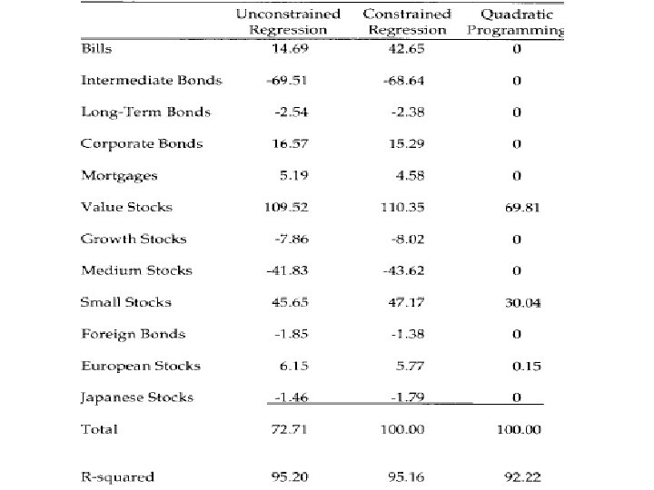 Style analysis • Regress the returns under evaluation on a sufficiently representative set of asset classes • This allows identification of the capital allocation decision • The proportion not explained: security selection
