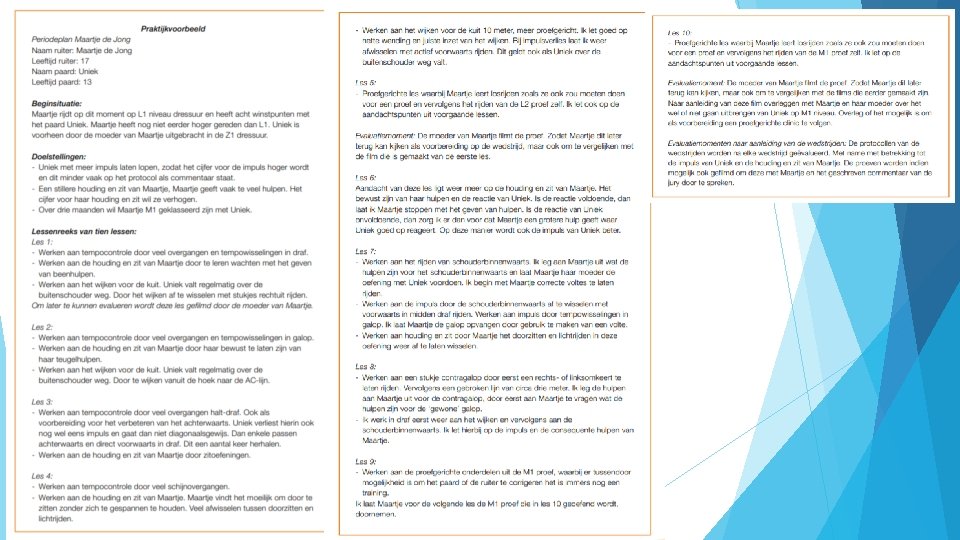 Je portfolio wordt beoordeeld op: Informeert en betrekt sporters, ouders, derden -adviseert ruiters over materiaal, voeding, hygiëne -maakt afspraken -besteedt aandacht aan voorkomen van blessures bij paarden en sporters Bereidt lessen voor -les draagt bij aan het realiseren van doelen op lange termijn -analyseert begin situatie van ruiter en eigen kwaliteiten -bouwt periodeplan logisch op -stemt periodeplan af op niveau sporters -concreet formuleren doelstellingen -beschrijft evaluatie momenten en methoden -werkt lessen uit passend in periodeplan en baseert lessen op periodeplan -verwerkt evaluaties in lesvoorbereiding -lesinhoud is afgestemd op mogelijkheden sporter -kiest verantwoorde lesopbouw