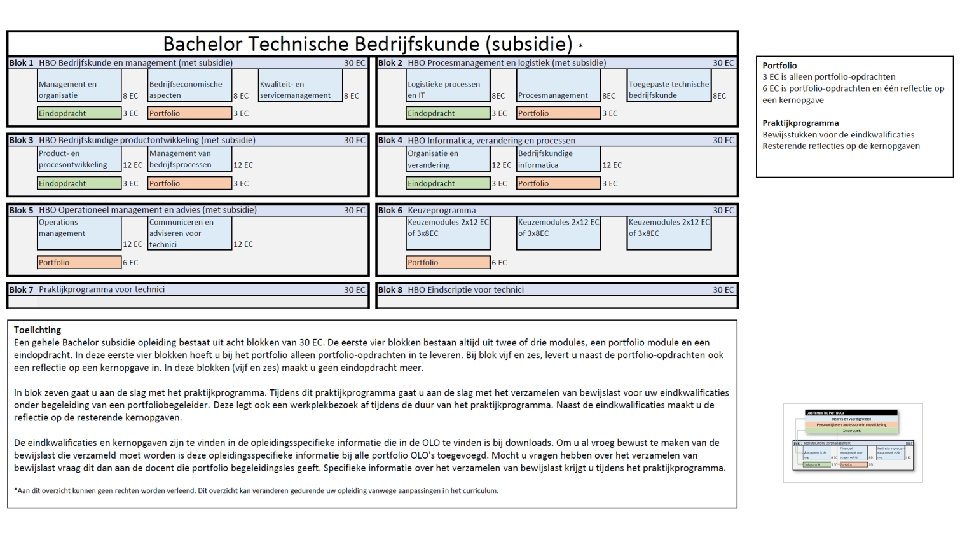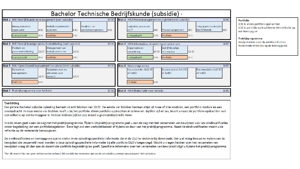 Bewijs eindkwalificaties • Bewijsstukken kunnen bijvoorbeeld de vorm hebben van een analyse, een stappenplan, een adviesplan, een commercieel plan, enzovoort. Een mail of een brief kan gebruikt worden als ondersteunend bewijs. Video, audio en foto’s kunnen ook gelden als bewijs. • Minimaal drie bewijsstukken per eindkwalificatie • Let op: deze bewijsstukken zijn niet gelijk aan de portfolio-opdrachten, eindopdrachten en moduleopdrachten! Bovenstaande opdrachten zijn gericht op kennis. • Eindkwalificaties gericht op houding en gedrag.