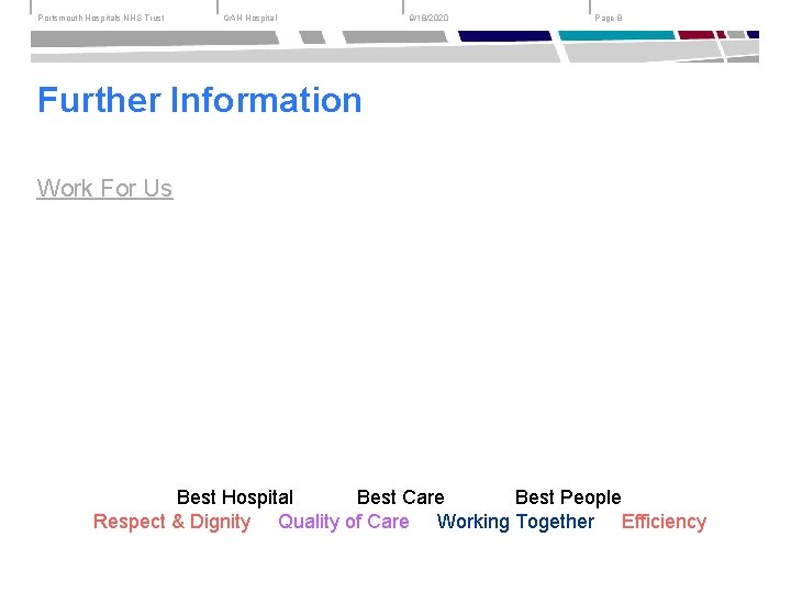 Portsmouth Hospitals NHS Trust QAH Hospital 9/18/2020 Page 8 Further Information Work For Us Best Hospital Best Care Best People Respect & Dignity Quality of Care Working Together Efficiency