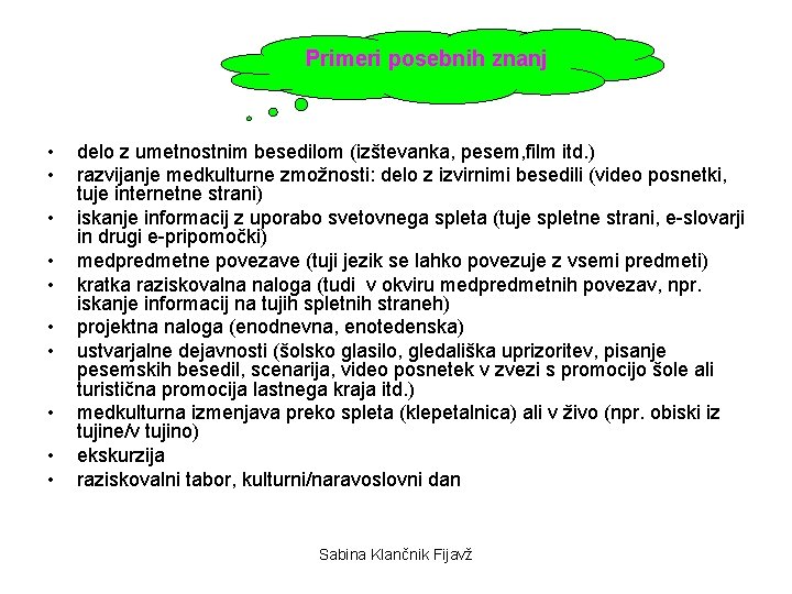 Primeri posebnih znanj • • • delo z umetnostnim besedilom (izštevanka, pesem, film itd. ) razvijanje medkulturne zmožnosti: delo z izvirnimi besedili (video posnetki, tuje internetne strani) iskanje informacij z uporabo svetovnega spleta (tuje spletne strani, e-slovarji in drugi e-pripomočki) medpredmetne povezave (tuji jezik se lahko povezuje z vsemi predmeti) kratka raziskovalna naloga (tudi v okviru medpredmetnih povezav, npr. iskanje informacij na tujih spletnih straneh) projektna naloga (enodnevna, enotedenska) ustvarjalne dejavnosti (šolsko glasilo, gledališka uprizoritev, pisanje pesemskih besedil, scenarija, video posnetek v zvezi s promocijo šole ali turistična promocija lastnega kraja itd. ) medkulturna izmenjava preko spleta (klepetalnica) ali v živo (npr. obiski iz tujine/v tujino) ekskurzija raziskovalni tabor, kulturni/naravoslovni dan Sabina Klančnik Fijavž