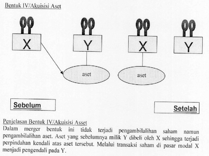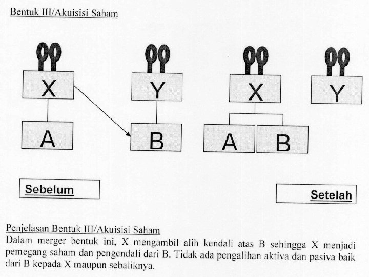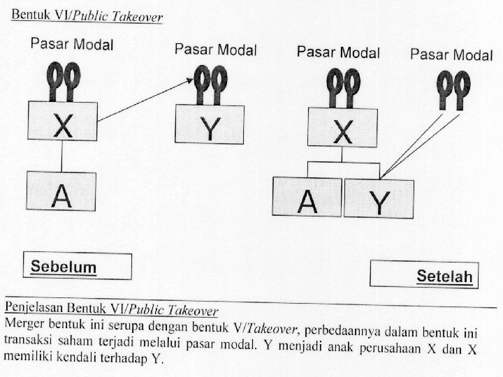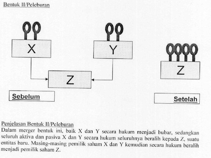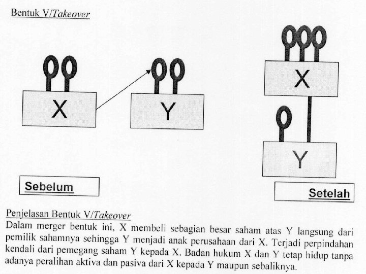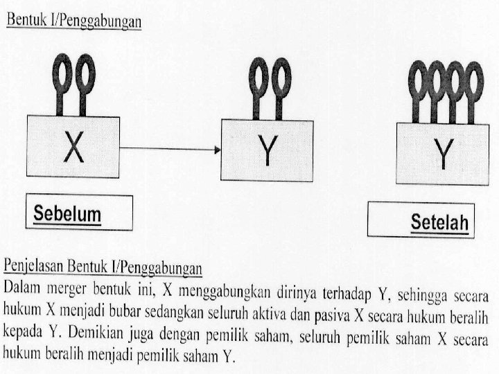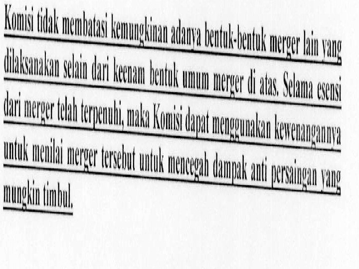 • Bentuk Umum Merger • Merger secara umum dapat terjadi dalam 3 (tiga) bentuk, yaitu: a. Merger Horizontal. Merger horizontal terjadi apabila dua perusahaan yang memiliki lini usaha yang sama bergabung atau apabila perusahaan yang bersaing di industri yang sama melakukan merger; b. Merger Vertical. • Merger vertical melibatkan suatu tahapan operasional produksi yang berbeda yang saling terkait satu sama lainnya, mulai dari hulu hingga ke hilir. Merger vertikal dapat juga berbentuk 2 jenis, yakni Upstream Vertical Merger dan Downstream Vertical Merger. c. Merger Konglomerat. Merger konglomerat terjadi apabila 2 (dua) perusahaan yang tidak memiliki lini usaha yang sama bergabung. Atau dengan kata lain, merger konglomerat terjadi antara perusahaan-perusahaan yang tidak bersaing dan tidak memiliki hubungan penjual-pembeli.