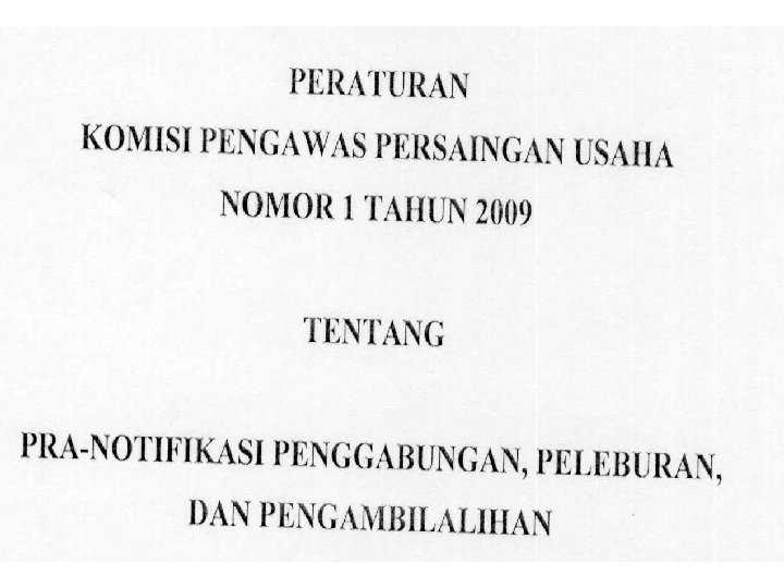 • Berbeda dengan ketentuan UU No. 5/1999 Pasal 29 yang secara tegas menyatakan bahwa kewajiban bagi Pelaku Usaha untuk melaporkan telah terjadinya merger selambat-lambatnya 30 (tiga puluh) hari sejak tanggal terjadinya merger tersebut. Ketentuan ini jelas memperlihatkan bahwa undang-undang persaingan usaha Indonesia menganut sistem post-merger notification. • Padahal untuk mencegah terjadinya pembatalan merger, undang-undang persaingan usaha di banyak negara lain mewajibkan pelaku usaha yang hendak merger untuk memberitahukan rencana mergernya terlebih dahulu (pre- merger notification) kepada otoritas persaingan usaha, sehingga otoritas tersebut dapat melakukan penilaian apakah merger tersebut mengakibatkan praktek monopoli dan/atau persaingan usaha tidak sehat, sehingga bisa ditentukan apakah merger tersebut dapat diterukan atau tidak.
