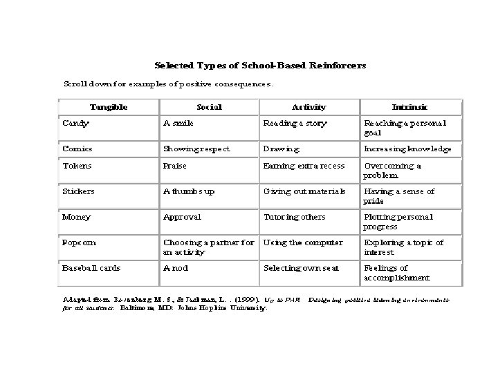 • Over time, move from: – Other-delivered to self-delivered (extrinsic vs. intrinsic motivation) – Highly frequent to less frequent – Predictable to unpredictable – Tangible to social • Individualize for students needing greater support systems