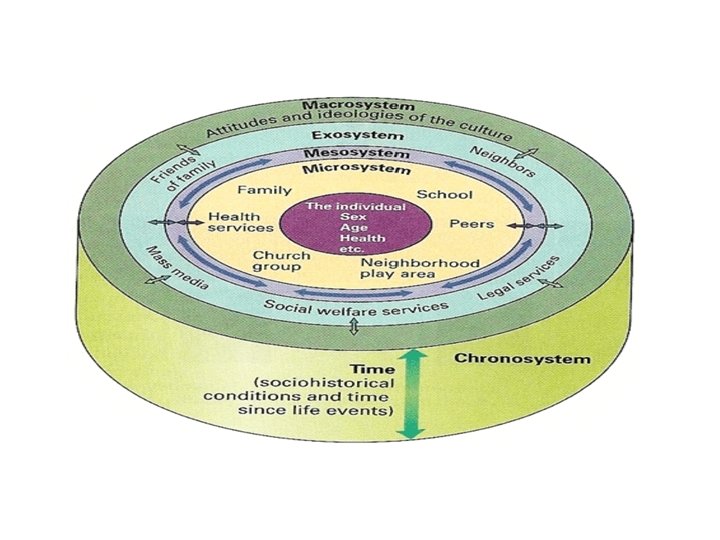 • 5 BASIC ENVIROMENTAL SYSTEMS • Microsystem --‐ The activities / interactions in the immediate environment --‐ The microsystem refers to relations between the child and the immediate environment, • Mesosystem --‐ Connections between microsystem. --‐ The interaction among two or more settings. • Exosystem --‐ An individual is not directly involved --‐ Contexts children are not a part of but may influence development • Macrosystem --‐ The larger socio--‐cultural context, cultural values and expectations • Chronosystem --‐ events occurring in the context of passing time.