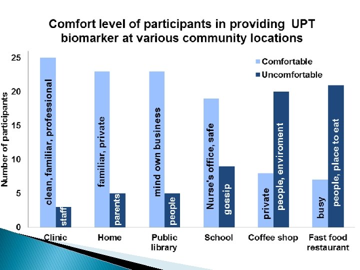 Results � All participants who provided a urine sample (68%) did so at a fast food restaurant, coffee shop, or library � Participants said that teens would be willing to provide urine samples if given a clear explanation of why the sample was needed