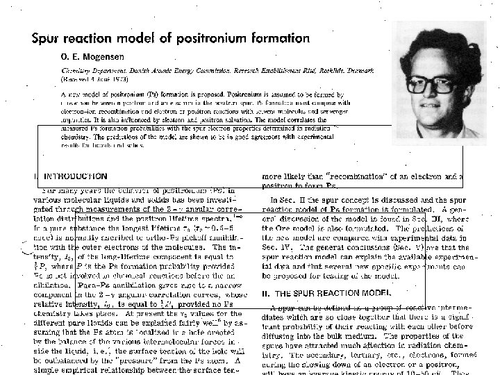 No Ps Formation Spur Reaction Model (by Mogensen) M → M+ + e- Ionization -R + e- → -R- electron scavenging -S + e+ → [-S, e+] positron scavenging