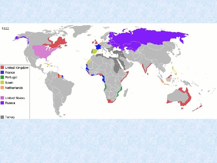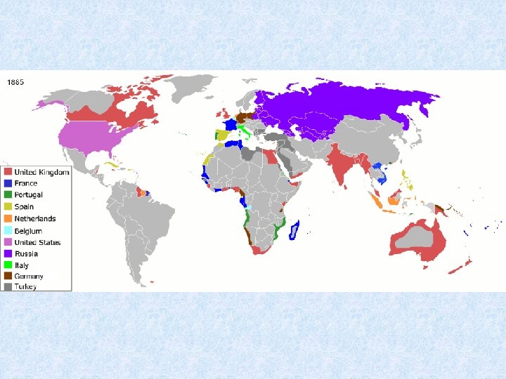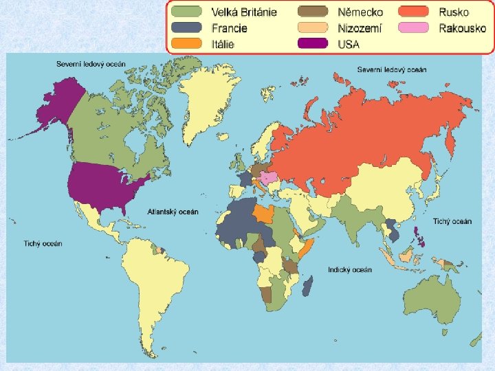 • Poslední čtvrtina 19. stol. - vrcholí závody o koloniální rozdělení světa -Afrika, Asie, Oceánie • Koloniální země: Británie, Francie, Německo, Portugalsko, USA, Rusko, Japonsko, Belgie, Holandsko • 1914 - 72 milionů km 2 a 560 milionů lidí- pod koloniální nadvládou (více než ½ pevniny a 1/3 obyvatelstva světa) • Afrika -1870 - kolonizována 1/10 • Afrika-1890 - kolonizováno 9/10