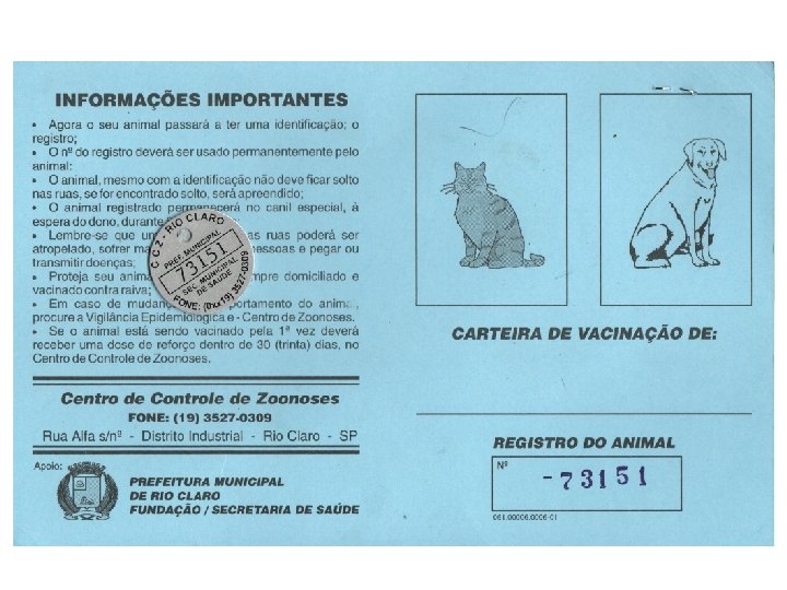 POSSE RESPONSÁVEL REGISTRO DO ANIMAL • Todo animal de estimação deve ter um documento de identidade. • O proprietário deve identificar seu animal junto à Prefeitura de Rio Claro no Centro de Controle de Zoonoses. • O animal registrado ganha uma plaqueta com seu número de identificação, a qual deve ser usada permanentemente à coleira, pois se o animal se perder possibilitará seu retorno ao verdadeiro proprietário.