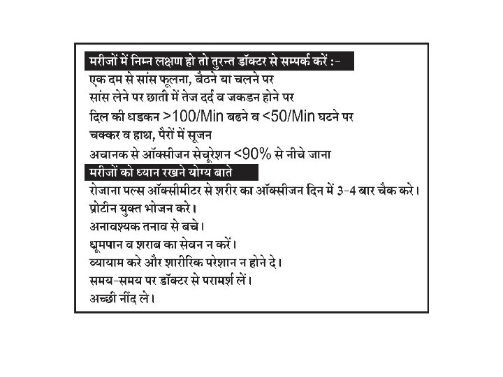 Breathlessness • A degree of breathlessness is common after acute covid-19. Severe breathlessness, which is rare in patients who were not Hospitalised, may require urgent referral. Breathlessness tends to improve with breathing exercises. • Pulse Oximeters may be extremely useful for assessing and monitoring respiratory symptoms after covid-19. • An exertional desaturation test should be performed as part of baseline assessment for patients whose resting pulse oximeter reading is 96% or above but whose symptoms suggest exertional desaturation (such as lightheadedness or severe breathlessness on exercise).