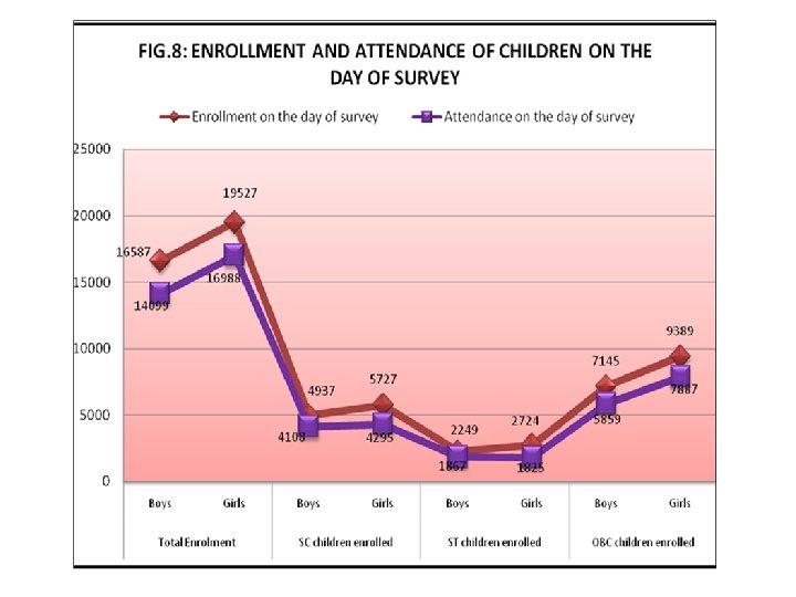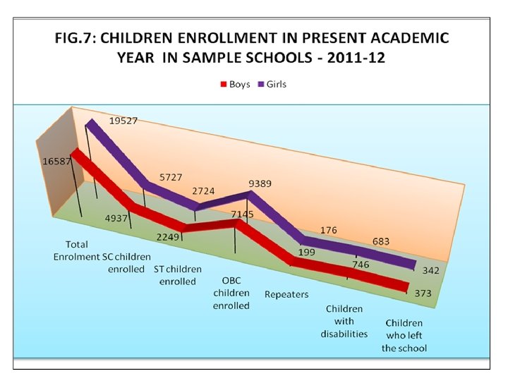 Contd. • Still considerable number of schools was not having exclusive toilets for girl children. Even in case of schools the toilets are available running water facility is not available. • Enrolment of girls (86. 30%) is quite encouraging especially among the SC, ST and OBC communities.