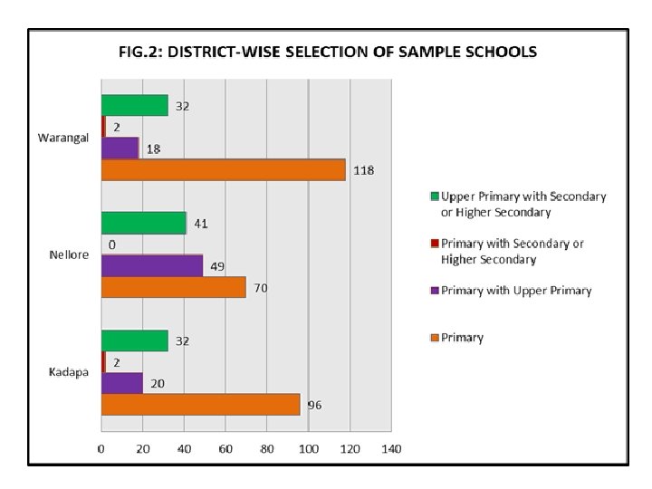 Sample DISTRIBUTION OF SAMPLE BY SCHOOL CATEGORY AND DISTRICT District Sl. No. School Category Kadapa Nellore Warangal Total 1 96 70 118 284 20 49 18 87 2 0 2 4 Primary with Upper Primary with Secondary or Higher Secondary Total % 32 150 31. 3 41 160 33. 3 32 170 35. 4 105 480 100. 0 2 3 4