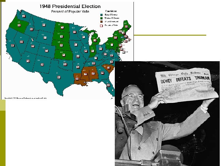 Truman Losing Support in ‘ 48 p Losing support of: n n n Liberal Dems – too aggressive in foreign policy = Progressives Southern Dems – Dixiecrats led by Strom Thurmond Rep– Thomas Dewey (Gov. NY) should win easily