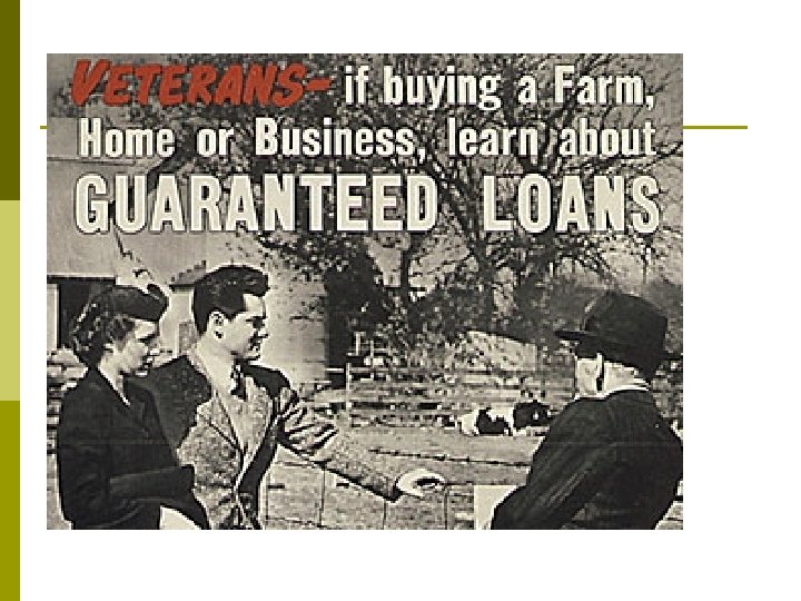 After the War: Will Depression Return? Demobilization: 15 million soldiers p G. I. Bill (Serviceman’s Readjustment Act): education paid for, loans for homes and businesses p Pent-up demand for consumer goods p Baby-boom generation: 1945 -1960 p Growth of suburbia: Levittown p Move to the “Sunbelt” – Florida to Cali p