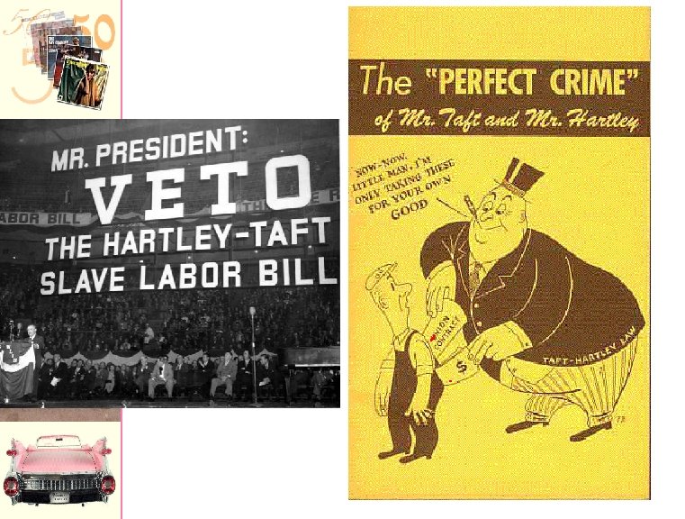 • Labor Unrest – United Mine Workers (John Lewis) • 40 day strike in 1943 • Truman orders govt seizure of mines – Employers meet many of the demands – The Rail Strike of 1946 • First ever complete shut down • Strike ended 3 minutes before Truman orders army to seize railroads and to draft strikers • Taft Hartley Act 1947 – a. k. a. “Slave Labor Bill” – Allows states to become “right to work” states • Truman Vetoes -> Veto overridden