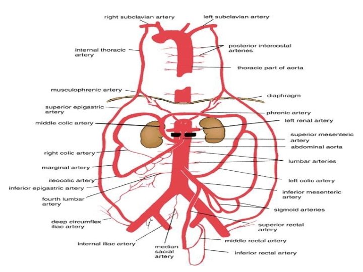 Abdominal aorta…. cont • Inferior Mesenteric Artery at level L 3 Branches • The left colic artery runs upward and to the left and supplies the distal third of the transverse colon, the left colic flexure, and the upper part of the descending colon. It divides into ascending and descending branches. • The sigmoid arteries are two or three in number and supply the descending and sigmoid colon. • The superior rectal artery is a continuation of the inferior mesenteric artery as it crosses the left common iliac artery. It descends into the pelvis behind the rectum. The artery supplies the rectum and upper half of the anal canal and anastomoses with the middle rectal and inferior rectal arteries