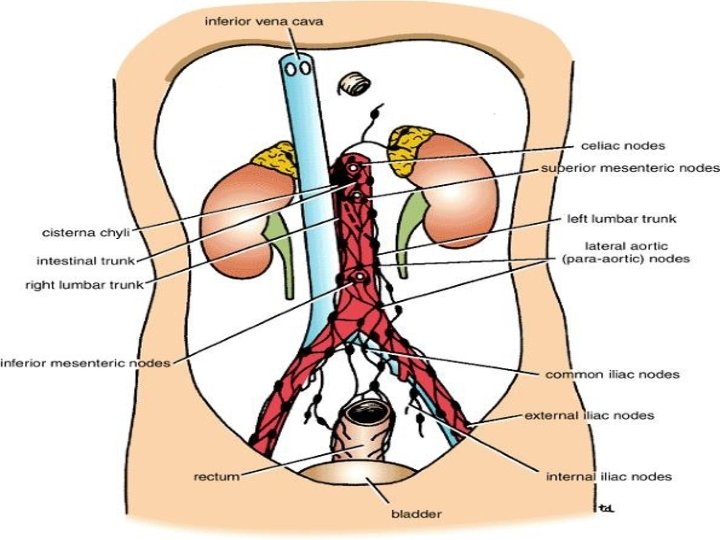 Lymphatics on the Posterior Abdominal Wall • • • Lymph Nodes The lymph nodes are closely related to the aorta and form a preaortic and a right and left lateral aortic (Para aortic or lumbar) chain. The preaortic lymph nodes lie around the origins of the celiac, superior mesenteric, and inferior mesenteric arteries and are referred to as the celiac, superior mesenteric, and inferior mesenteric lymph nodes, respectively. They drain the lymph from the gastrointestinal tract, extending from the lower one third of the esophagus to halfway down the anal canal, and from the spleen, pancreas, gallbladder, and greater part of the liver. The efferent lymph vessels form the large intestinal trunk. The lateral aortic (para-aortic or lumbar) lymph nodes drain lymph from the kidneys and suprarenals; from the testes in the male and from the ovaries, uterine tubes, and fundus of the uterus in the female; from the deep lymph vessels of the abdominal walls; and from the common iliac nodes. The efferent lymph vessels form the right and left lumbar trunk The thoracic duct commences in the abdomen as an elongated lymph sac, the cisterna chyli. This lies just below the diaphragm in front of the first two lumbar vertebrae and on the right side of the aorta.