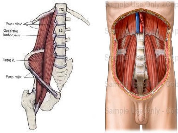 Muscles of post. abdominal wall Psoas major • Origin: body & transverse process of lumbar vertebra & intervertebral disc • Ins : Lesser trochanter of femur • N. S: nerve plexus(T 12, L 1, L 2. L 3) • Action: flexion of hip & thigh Quadratus lumborum • Origin: Iliolumbar lig. & iliac crest • Ins: 12 th rib • N. S: nerve plexus(T 12, L 1, L 2. L 3 • Action: fix or depresses 12 th rib during respiration & lateral flexion of the trunk Iliacus muscle • Origin: iliac fossa • Ins: Lesser trochanter of femur • N. S: femoral nerve • Action: Lateral flexion of hip & thigh for lying position
