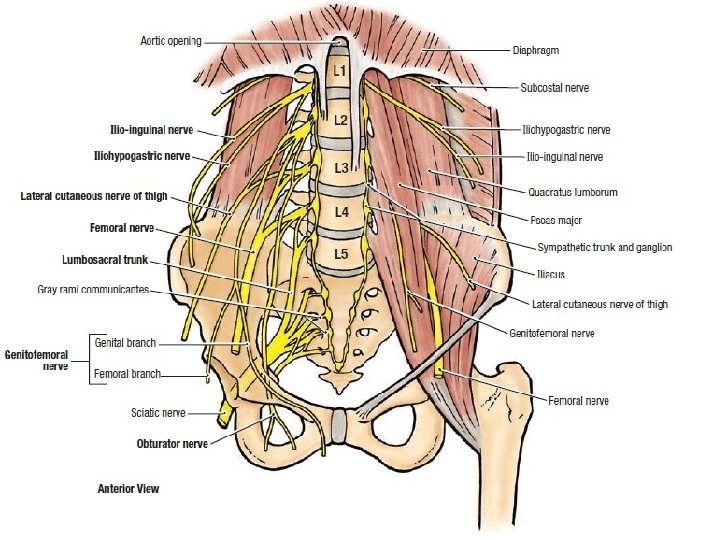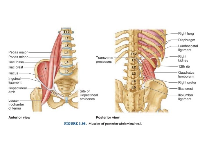 MUSCLES OF POSTERIOR ABDOMINAL WALL “ 3 Main paired muscles ” MUSCLE ACTION NERVE ORIGIN INSERTION 1. Psoas Flex thigh L 2 -L 4 Tranverse process ของ T 12 -L 5 Lesser trochanter of femur 2. Iliacus Flex thigh L 2 -L 4 Iliac fossa Sacrum 3. Quadratus lumborum Extend vertebra T 12 -L 4 Ribs Lesser trochanter of femur Iliolumbar lig. Iliac crest