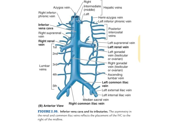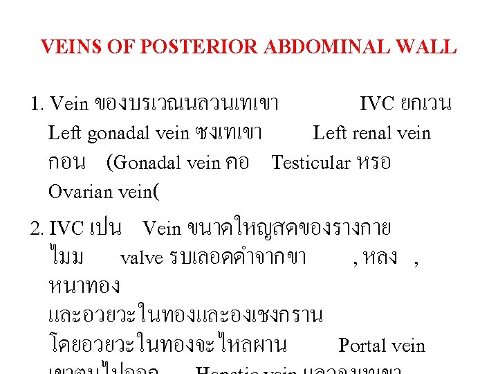 VEINS OF POSTERIOR ABDOMINAL WALL 3. IVC ตงตนท Common iliac vein 2 ขางมาบรรจบกนทระดบ L 5 ซงอย Inferior ตอ Bifurcation ของ Abdominal aorta ความยาวของ Abdominal IVC คอ 20 cm. 4. IVC Ascend ขนบนอยดานขวาของ Abdominal aorta ตงแตระดบ L 3 ถง L 5 และอยขาง Right psoas muscle เขา Hiatus ทระดบ T 8 -T 9 5. Tributaries ของ IVC ม Common iliac veins, Lumbar veins, Right gonads vein, Renal veins, Hepatic veins , etc.