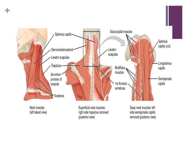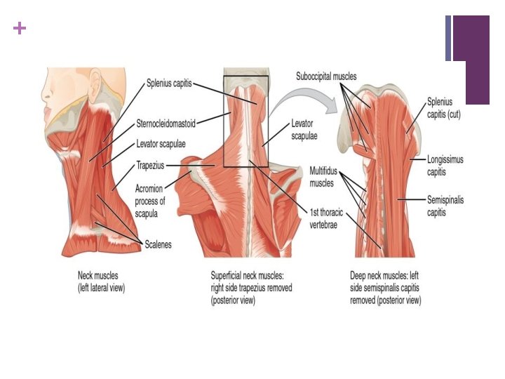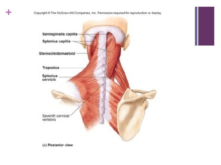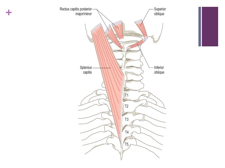 + Suboccipital muscles n Rectus capitus posterior major: n O: spinous process of axis n I: lateral portion of occipital bone below inferior nuchal line n N: posterior ramus of C 1 , same for all suboccipital muscles n A: extension of head and rotation of head towards the same side