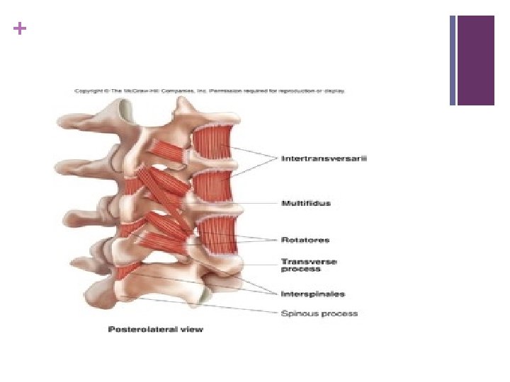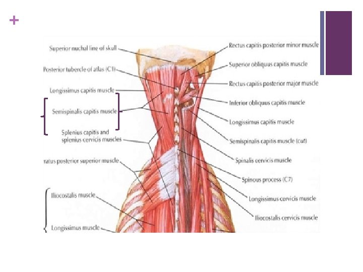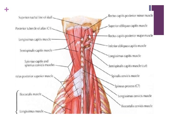 + Transversospinales n Semispinalis thoracis arises on the transverse processes of T 6 to T 10 and attaches on the spinous processes of C 6 to T 4. More tendon in form. n Semispinalis cervicis arises on the transverse processes of T 1 to T 6 and attaches on the spinous processes of C 2 to C 5. More muscular especially the fibres that attach on the axis. n.