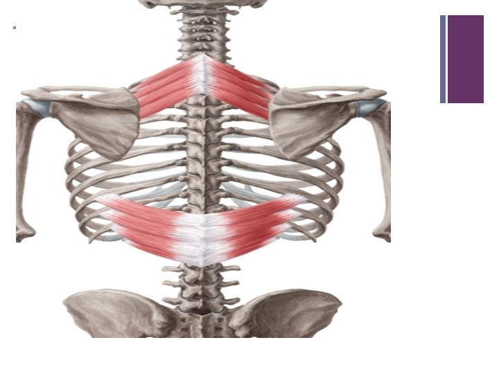 + Intermediate group of muscles n Serratus posterior superior: n O: lower portion of ligamentum nuchae, spinous process of C 7 T 3 and supraspinatous ligament n i: upper border of ribs 2 nd to 5 th just lateral to their angles n N: anterior rami of upper thoracis nerves T 2 -5 n A: elevates the ribs 2 -5