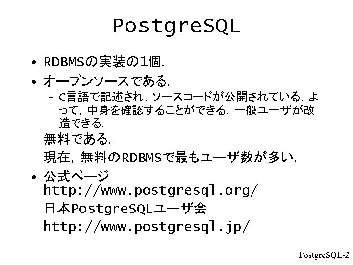 Postgre. SQL http: //www. ns. kogakuin. ac. jp/~ct 13140/Prog. 2008/ Postgre. SQL-1